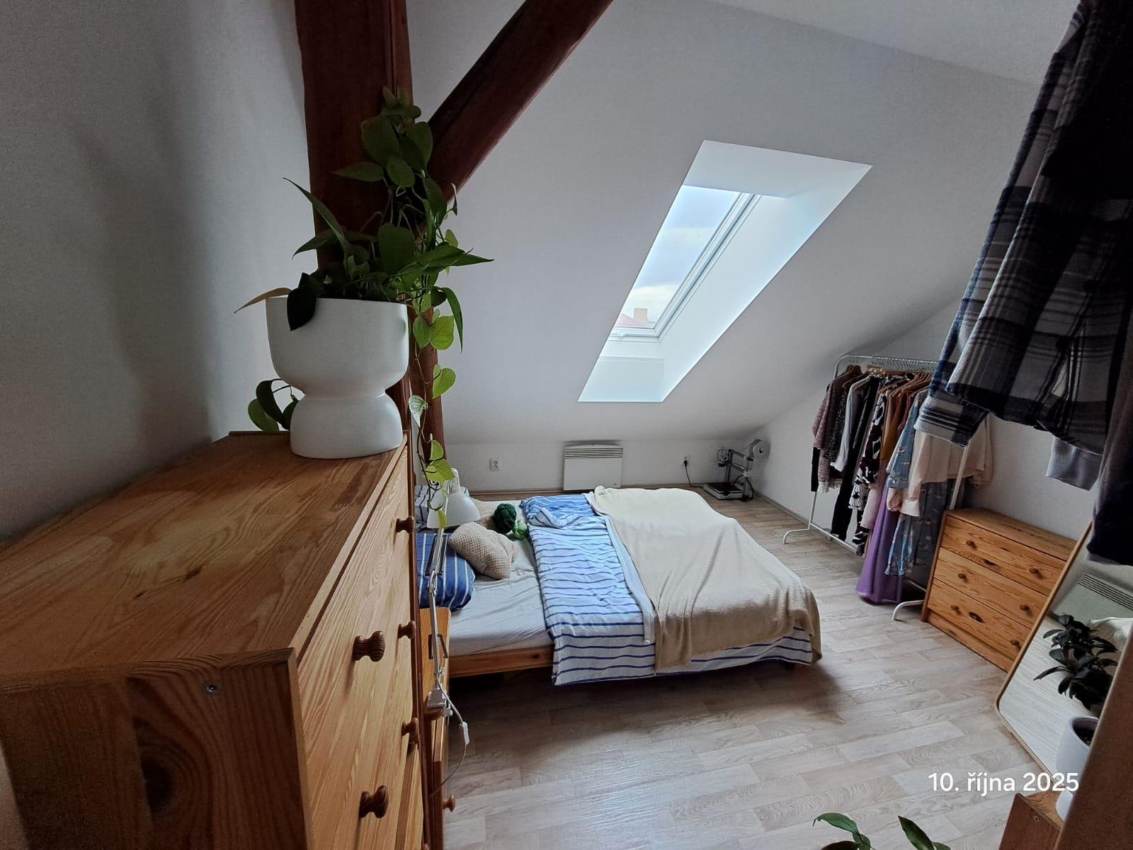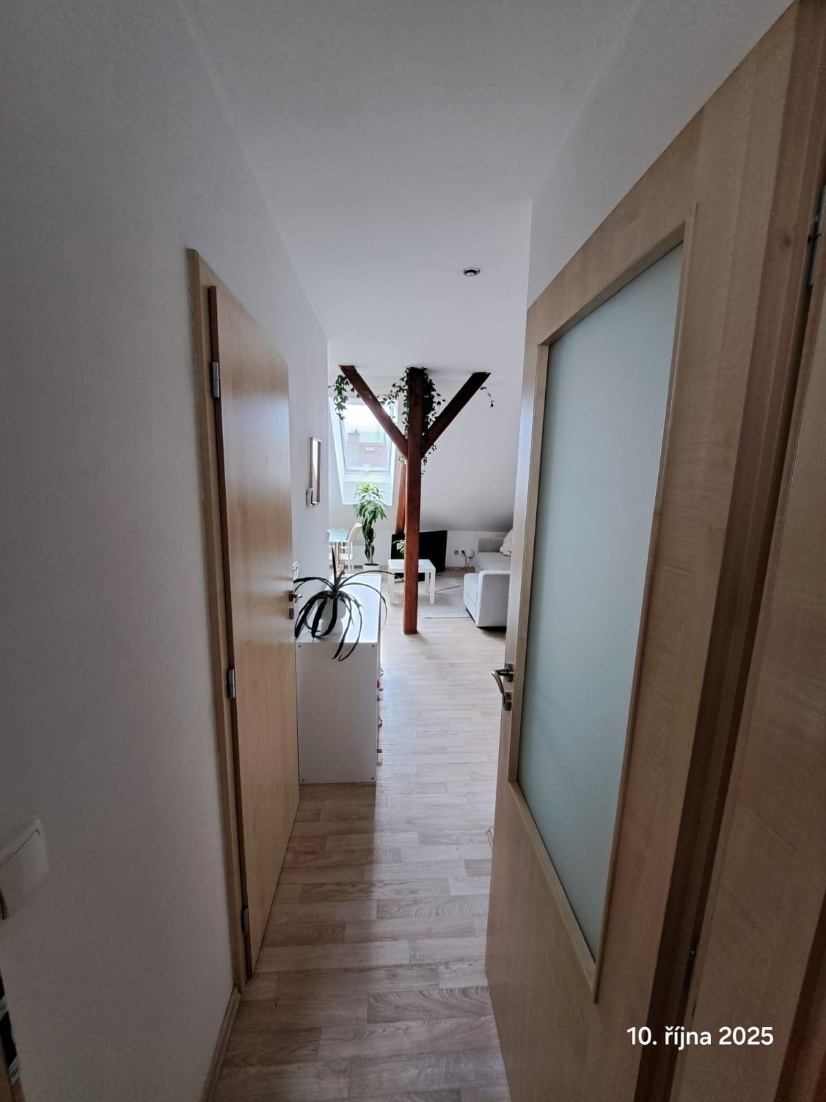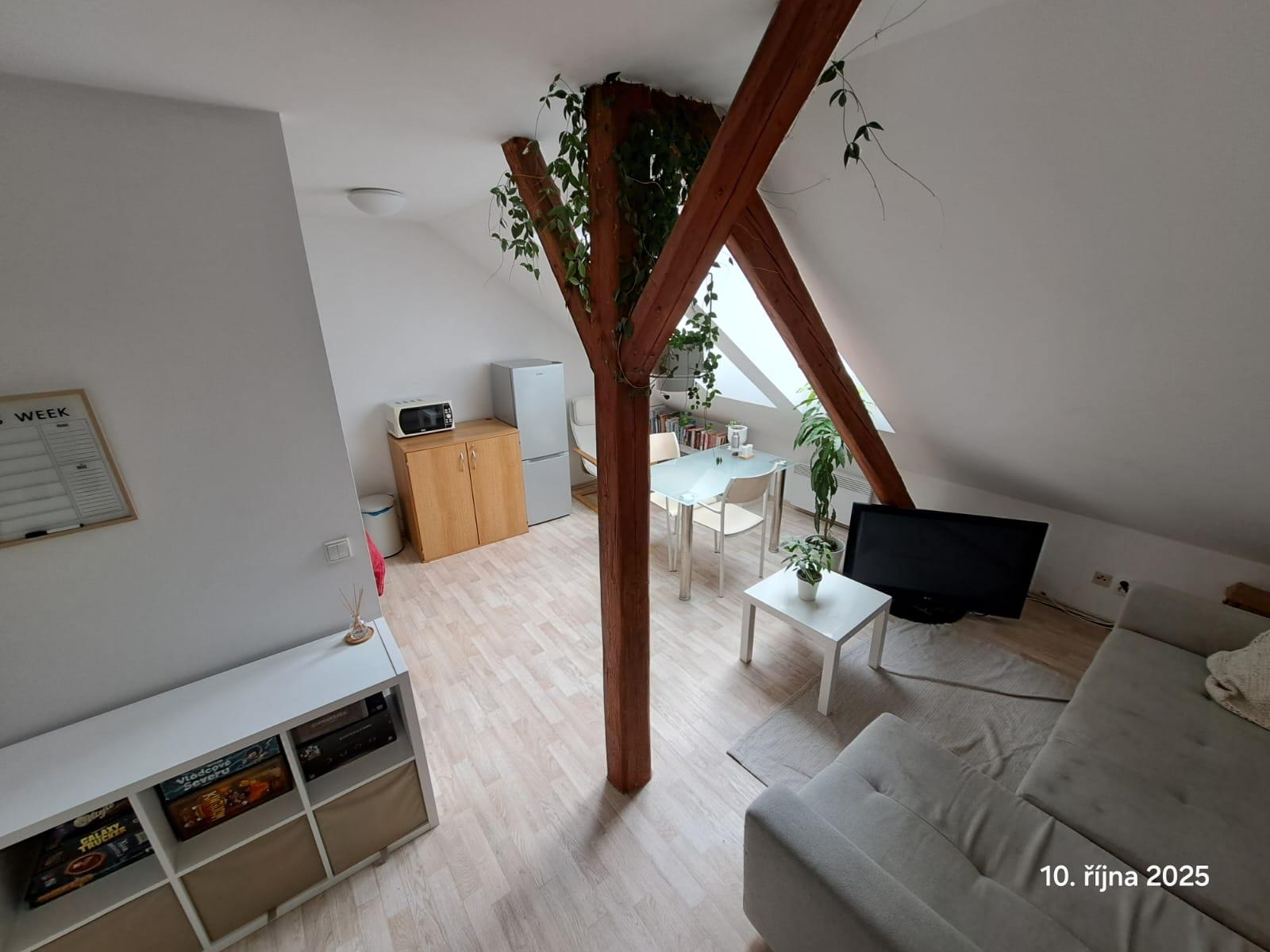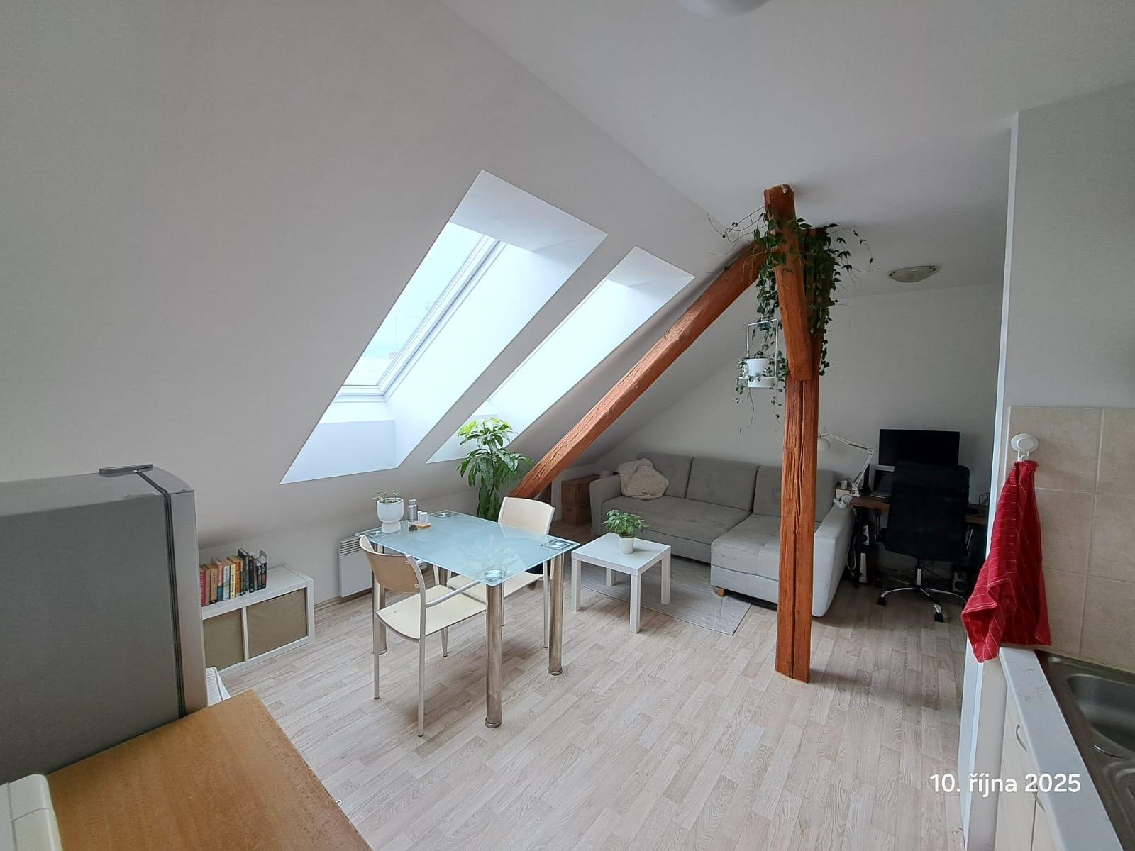 Nabízíme pronájem bytu o dispozici 2+kk umístěného v 6.NP bez výtahu na ulici Zeyerova v Olomouci. Byt je umístěný v podkroví bytového domu a má podlahovou plochu cca 45 m2, 1 samostatný pokoj a obývací místnost s kuchyňskou linkou. Koupelna se sprchovým koutem a WC. Jednotka je v současné době pronajata a  pronajímá se nezařízená. Po domluvě se současnými nájemníky lze přenechat určité vybavení bytu. Byt bude k nastěhování od 20. 12. 2025. Prohlídky budou probíhat 1 x týdně po domluvě s nájemníky. Dům má výbornou polohu, v okolí hlavní nádraží Olomouc, supermarket Albert, Poliklinika AGEL, pěší dostupnost k fakultám UP - Pedagogické a Přírodovědecké. Zastávka tramvaje Na Bystřičce 2 min. Měsíční nájemné činí 9.400,-Kč, zálohy na vodu činí 400,-Kč/osoba/měsíc, zálohy na osvětlení a úklid spol.prostor 200,-Kč/měsíc, zálohy na elektřinu cca 2.000,-Kč, tu si přepíše nájemce sám na své jméno. Vratná kauce ve výši 1 nájmu, provize RK.